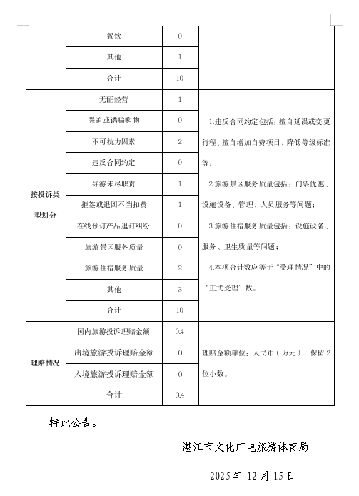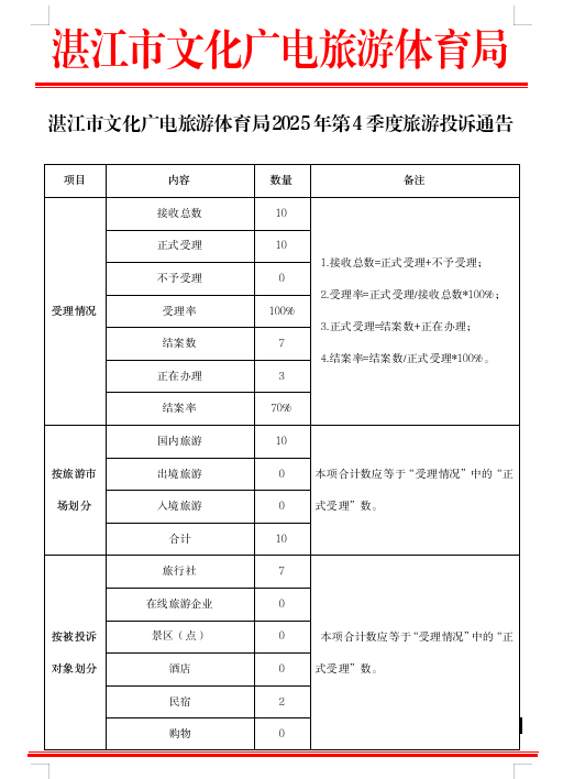 湛江市文化广电旅游体育局2025年第4季度旅游投诉通告