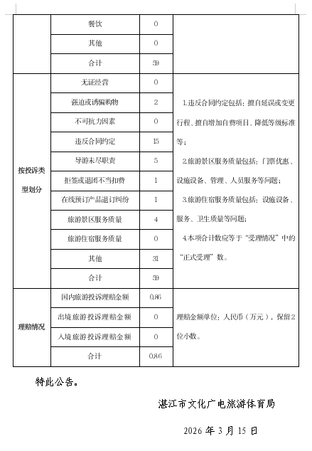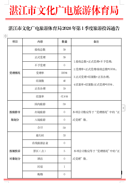 湛江市文化广电旅游体育局2026年第1季度旅游投诉通告