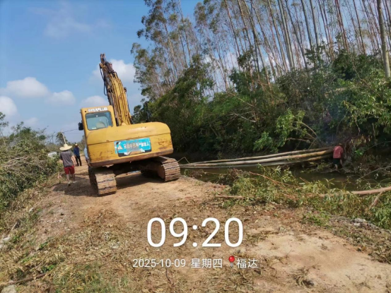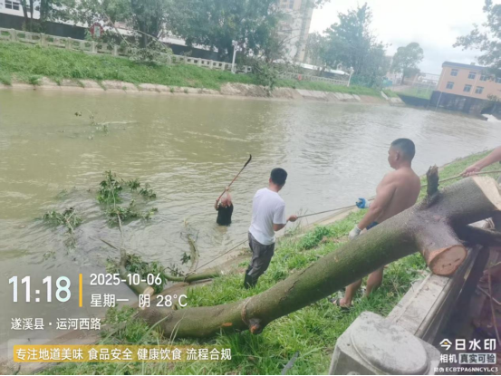 三、全员联动,恢复河道整洁秩序。自10月6日起,办公室牵头对所部公共区域开展“清积水、扫杂物、除落叶”专项清扫行动,有效改善单位整体环境面貌。各站点采用人工搬运与机械辅助相结合的方式,同步推进河道障碍物清理工作,集中清除倒伏树木、断枝、垃圾等漂浮物,避免堵塞河道影响行洪,切实守护运河水质安全。针对沿岸被台风损毁的护栏网、警示牌,第一时间进行重新安装与加固,确保河道防护设施功能恢复。目前,我所累计投入勾机、油锯等设备,清理河道及堤坝两侧倒伏树木100余棵、垃圾杂物约20吨,修复损坏护栏300米、警示牌50余块。