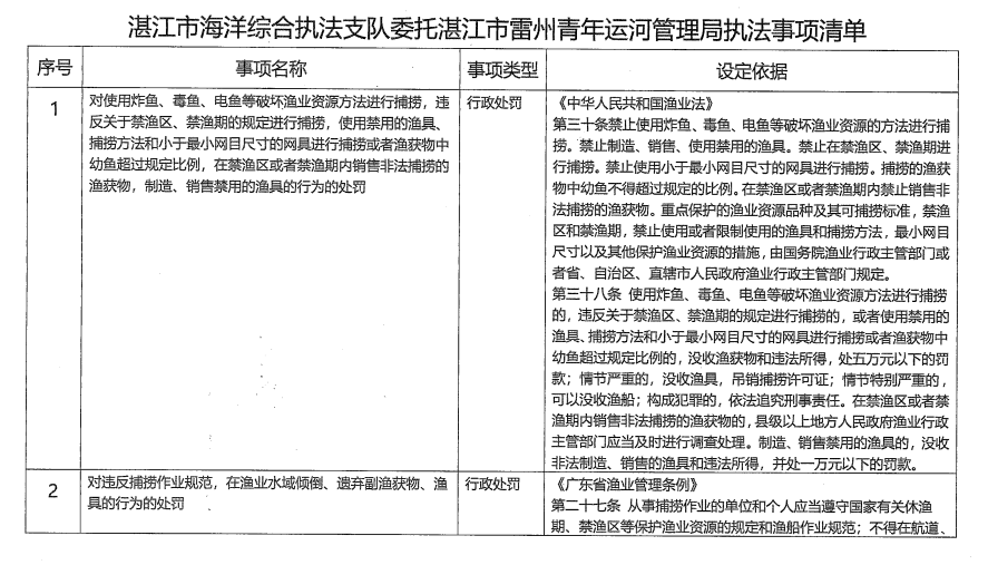 根据《中华人民共和国行政处罚法》《中华人民共和国渔业法》《广东省渔业管理条例》以及《湛江市鹤地水库饮用水水源保护条例》第三十五条“本条例规定由有关主管部门实施的行政处罚,有关主管部门可以依法委托鹤地水库管理机构实施”的规定,现将湛江市海洋综合执法支队相关执法权限委托给湛江市雷州青年运河管理局行使,委托内容如下: