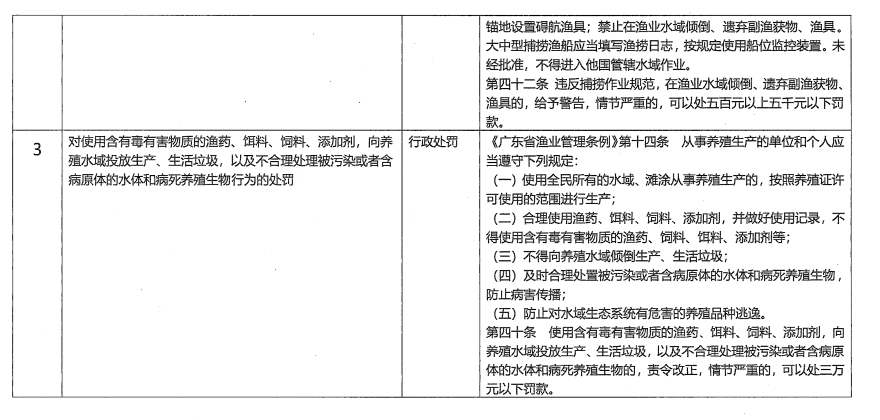 3.对使用含有毒有害物质的渔药、饵料、饲料、添加剂,向养殖水域投放生产、生活垃圾,以及不合理处理被污染或者含病原体的水体和病死养殖生物行为的处罚。