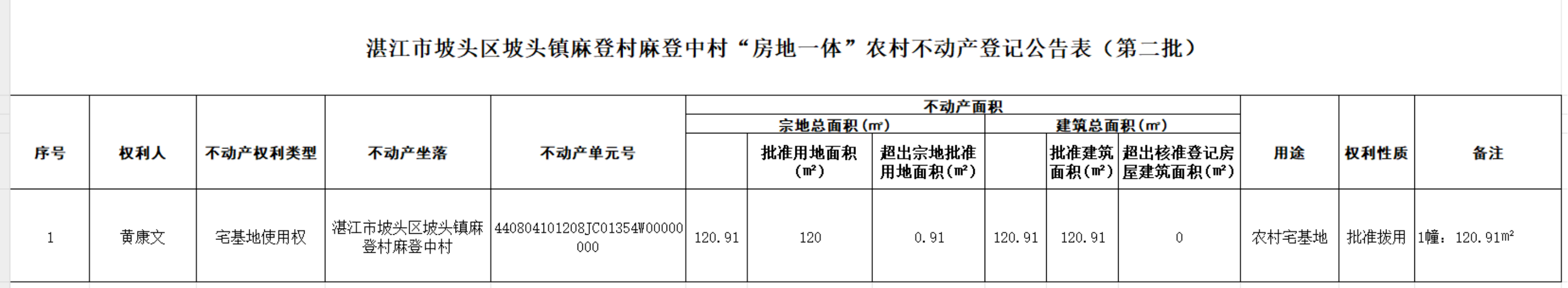 附表:坡头区坡头镇麻登村麻登中村“房地一体”农村不动产登记公告表(第二批)