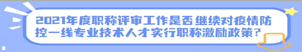 2021年度疫情防控一线专业技术人员的职称评审,继续执行《关于在打赢疫情防控阻击战中担当作为的医务防疫人员实施职称激励措施的通知》(粤人社函〔2020〕37号)、《转发人力资源社会保障部办公厅关于做好新冠肺炎疫情防控一线专业技术人员职称工作的通知》(粤人社函〔2020〕60号)、《关于建立保护关心爱护医务人员长效机制的指导意见》(国卫人发〔2021〕13号)等规定。