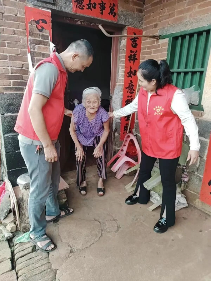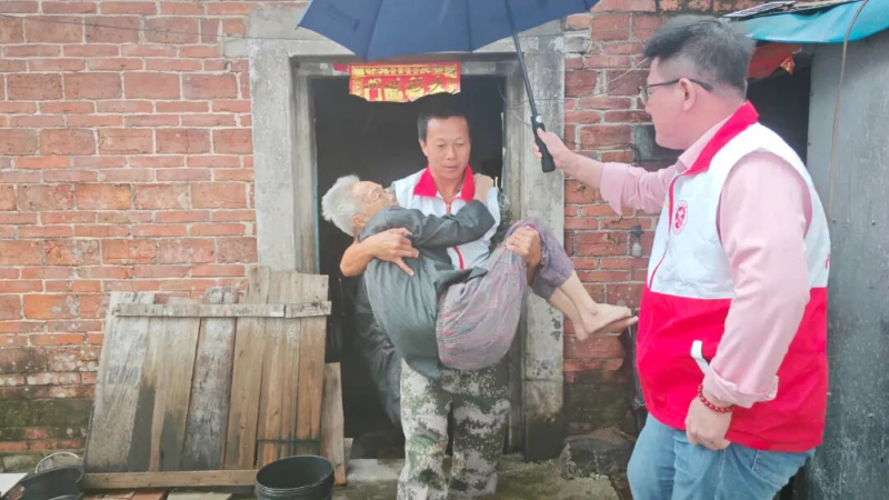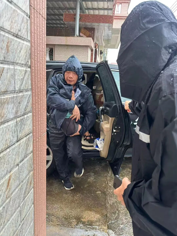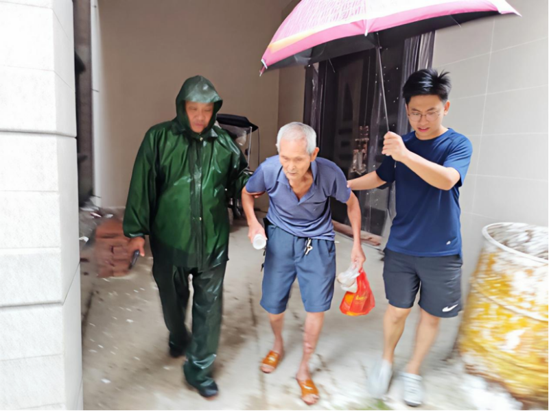 坡头党员干部将在风雨中前行的老奶奶与孩童护送回家。