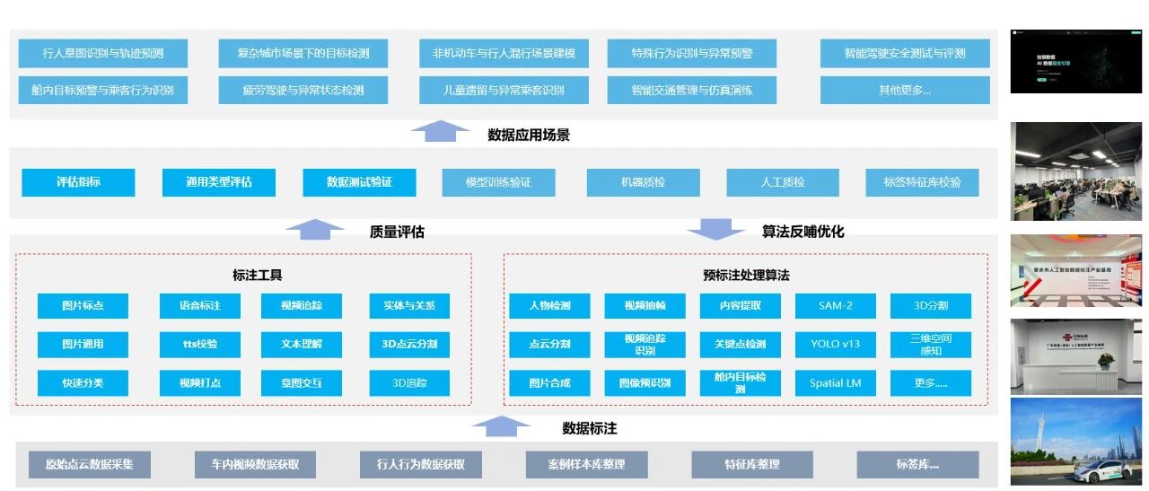 一是构建多模态高质量数据集,覆盖自动驾驶核心场景。聚焦车内驾驶行为、车外行人意图与多模态环境感知三大方向,采集包含近1亿张驾驶舱内典型驾驶状态及行人高风险行为的图片、视频数据,复杂路况、极端天气、弱纹理环境等600万帧多源感知场景的点云数据,形成结构化、标签体系完善的数据集,解决了自动驾驶在真实环境中感知精度不足、场景覆盖不全的问题。